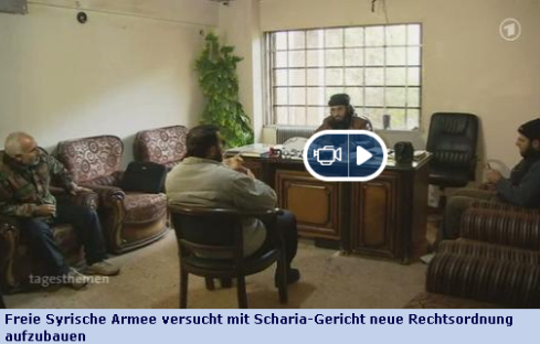 Grenzgebiet: "Mitten im Krieg entwickeln sich in Syrien die Anfänge eines neuen Staates: Schritt für Schritt versuchen die Rebellen, in den von ihnen kontrollierten Gebieten Rechtsordnungen zu schaffen. Mit Scharia-Gerichten und Polizisten gehen sie gegen Verbrecher vor". [Quelle: ARD] Die ARD übergeht – von der völligen Illegalität der Veranstaltung mal abgesehen - geflissentlich, dass nicht auf Grundlage eines Gesetzbuches, sondern nur anhand des Korans verhandelt wird. Keine Information auch darüber, dass dieses "befreite" (Originalton!) Gebiet an der quasi offenen türkischen Grenze und nicht im Landesinneren liegt; auch nichts über die Nationalität dieses „Scheich Abdurrahman“. Erhellend aber wenigstens, dass das „Gericht“ über eine „bewaffnete Spezialtruppe“ verfügt, um die Sprüche des „Richters“ durchzusetzen. „Syrien: Rebellen nehmen im Norden Rechtsordnung in die Hand“ In dem was die ARD am 16. Januar zynisch "Rechtsordnung" (!) und „Befreite Gebiete“ unter Kontrolle der „FSA“ nennt, „trägt jeder eine Kalaschnikow, wimmelt es von Schmugglern und Schiebern. Die Preise haben sich verzehnfacht. Die wachsende Kriminalität ist unübersehbar.“ Dies beiläufig zu erwähnen kommen die
