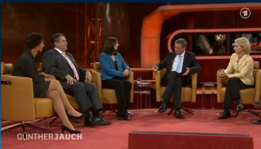 [..] Man kann übrigens anfangen bei wem man will. Nehmen wir als Erstes diese unsägliche Ursula von der Leyen. In unerträglicher Jahrmarkt-Lautstärke und Penetranz trommelte die hübsch haarspraysteif Frisierte ohne Unterlass, ohne Maß und Rhythmus um Stimmen für ihre Partei. Noch der größte Schlenker war ihr gerade gut genug, anderen das Wort abzuschneiden, Jauchs Oberarm dabei ständig zu quetschen, ebenso wie den ihres Kabinettskollegen Daniel Bahr von der FDP. So etwas ging vielleicht damals, als die knarzige Alte noch jünger allein unter Männern Regionalpolitik verantwortete, hier wirkte es auf unangenehme Weise aufdringlich, nervig, anachronistisch und vorlaut. [..]
